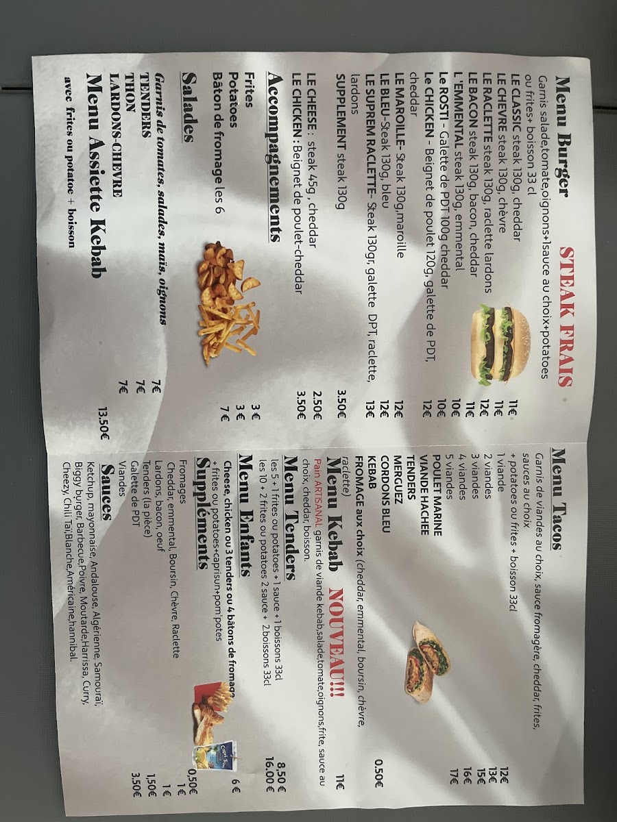 Welcome to Burger sans faim, a delightful fast food gem located at 16 Grande Rue, Chivres-en-Laonnois, France. This restaurant promises a satisfying culinary experience with a menu that emphasizes quality and flavor. At the heart of their offerings is the Hamburger Steack frais du boucher (€12.00), a juicy creation that reflects the craftsmanship of local butchers.